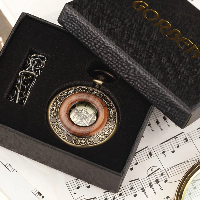 Related Product for Box Package Solid Wood Mechanical Pocket Watch FOB Chain Locket Dial Hollow Steampunk Skeleton Men